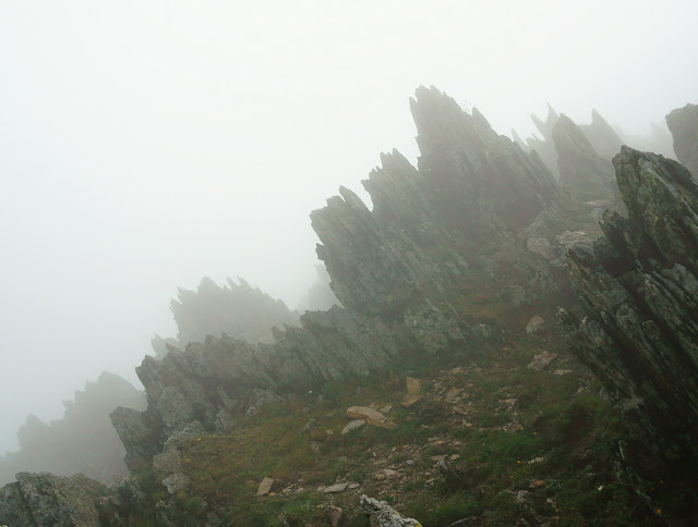 A continuación seguimos por la carena por una zona de continuos picos y collados pero con escaso desnivel, que apenas vemos por la espesa niebla. Por orden serían el coll de Tarabaus, el coll de Rumpisó, el Puig de Tarabaus, el coll dels Empedrats, la Torre Petita, el Puig d'en Jordá y el coll de la Perdiu, éste último mucho más marcado, antes de la ascensión al Puig de la Calma. A falta de paisajes la botánica nos da un aliciente más al camino.